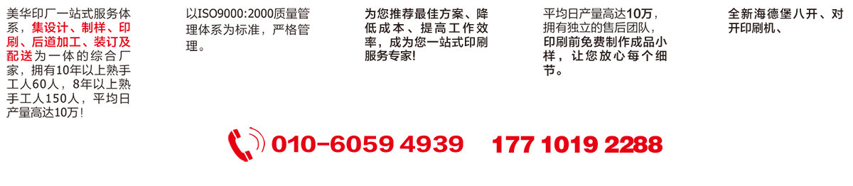 ?北京美華陽(yáng)光印刷設(shè)計(jì)有限公司是一家集設(shè)計(jì)、印刷、后期加工等服務(wù)于一體、實(shí)力較強(qiáng)的專(zhuān)業(yè)印刷團(tuán)隊(duì)。成立至今,經(jīng)歷多年的發(fā)展,我們積累了服務(wù)于多家中外知名企業(yè)的豐富經(jīng)驗(yàn),使我們不斷地成長(zhǎng)和壯大;創(chuàng)造行業(yè)品牌,如今美華陽(yáng)光印刷仍以追求高品質(zhì)及優(yōu)質(zhì)服務(wù)為發(fā)展基礎(chǔ)。在全體員工的共同努力下,美華現(xiàn)已成為以技術(shù)過(guò)硬、質(zhì)量?jī)?yōu)異、工藝先進(jìn)、實(shí)力強(qiáng)勁而著稱(chēng)的新型印刷團(tuán)隊(duì),贏(yíng)得了良好的聲譽(yù)。為為了適應(yīng)市場(chǎng)的需求和滿(mǎn)足客戶(hù)對(duì)印刷品高質(zhì)量的要求,美華陽(yáng)光印刷不斷更新引進(jìn)國(guó)外先進(jìn)印刷設(shè)備和印刷技術(shù),現(xiàn)已擁有德國(guó)海德堡四色印刷機(jī)、日本小森超級(jí)麗色龍四色印刷機(jī),全自動(dòng)電腦連續(xù)票據(jù)輪轉(zhuǎn)印刷機(jī),無(wú)碳復(fù)寫(xiě)專(zhuān)用印刷機(jī)和全自動(dòng)打號(hào)配頁(yè)機(jī),并配備齊全的后期加工設(shè)備;建立起以客戶(hù)為中心的一條龍專(zhuān)業(yè)印刷服務(wù)體系,同時(shí)聘請(qǐng)了來(lái)自美術(shù)院校的專(zhuān)業(yè)平面設(shè)計(jì)師,和經(jīng)驗(yàn)豐富的專(zhuān)業(yè)印刷技術(shù)人才,來(lái)滿(mǎn)足客戶(hù)高品質(zhì)的要求。我我們從前期工藝開(kāi)單、制版、開(kāi)紙、印刷、后期加工、裝訂、成品出庫(kù)、配送等一系列全部電子信息化管理,大大提高了印刷工藝高精準(zhǔn)要求和工作效率,節(jié)省了人工成本。目前美華擁有商業(yè)印刷設(shè)備、嚴(yán)整的印刷工藝流程和精細(xì)化管理體系,具備全年全天候連續(xù)生產(chǎn)能力。美華不斷追求技術(shù)創(chuàng)新和管理制度的理念,必將為廣大客戶(hù)提供.............................[點(diǎn)擊查看詳細(xì)介紹]